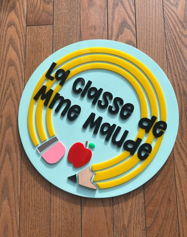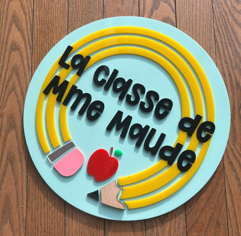 L'affiche de Maude fait 12 pouces de diamètre et la façon idéale de l'accrocher à un mur est avec un velcro 3M qui tiendra bien le panneau en place sans percer les murs de la classe ou de la maison. Le modèle exactement comme la photo (mais personnalisé avec votre prénom) est 78$. Vous pouvez aussi utiliser un support pour tenir le panneau en angle, comme sur la photo de «Shoes à la Crème».