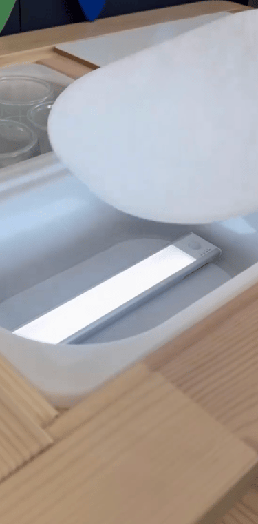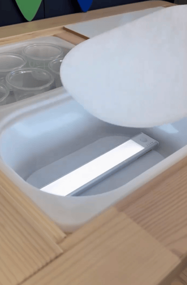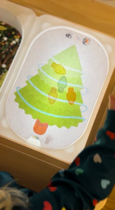 On met d'abord la lumière dans le bac (celle que j'offre et que je recommande d'acheter est un peu plus bas sur cette page), puis on met le plateau lumineux blanc qui permet à la lumière de passer. On y dépose la fiche plastifiée ou non et finalement le plateau transparent effaçable qui permet de tracer les lignes, faire de la pré-écriture, relier les éléments, dessiner, etc.