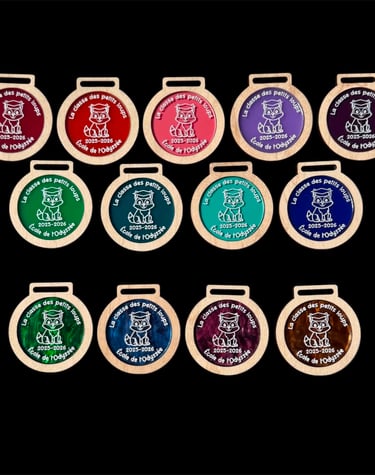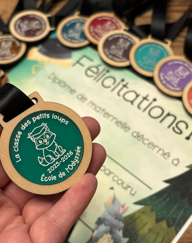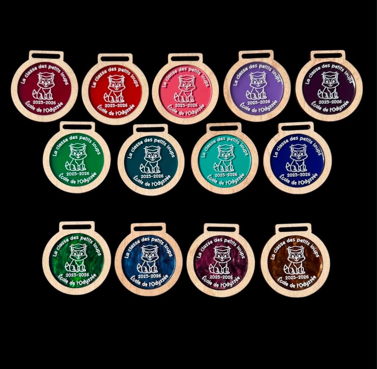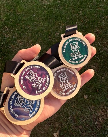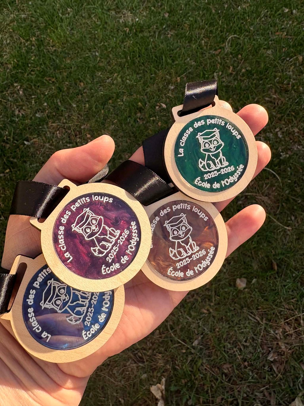 J'ai souvent eu des demandes pour des médailles pour la fin des années scolaires, de la garderie et autres. Voici donc officiellement mon modèle en érable vernis et en acrylique! Comme c'est un produit personnalisable à vos besoins et désirs, il suffit de remplir une soumission avec le plus de détails possibles ou de m'écrire sur Facebook et je pourrai vous donner plus d'informations quant aux délais et prix.