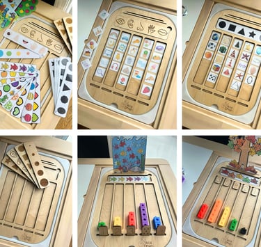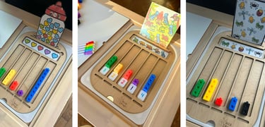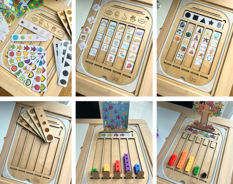 Le plateau a été conçu pour travailler les 5 sens, l’ordre croissant et décroissant ainsi que les formes en les démêlant selon les colonnes.