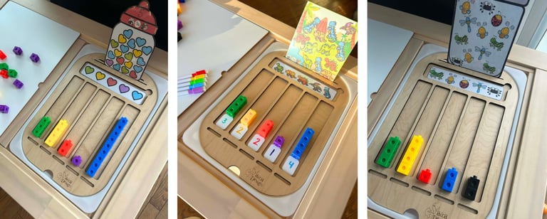 Toutefois, vous pourrez également utiliser les superbes fiches de Caravan pour faire un décompte d'objet et transformer le tout en diagramme à bandes! On glisse la grande image dans l'insertions U haut du plateau et on place la bande d'objets dans le rectangle arrondi. L'enfant compte ensuite le nombre d'objets de chaque couleur (les poissons rouges, par exemple) et les représentent dans les bonnes colonnes à l'aide de petits blocs. Par la suite, il pourra utiliser les 5 petites insertions dans le bas du plateau pour y insérer les chiffres, dominos ou doigts et ainsi représenter le bon chiffre de la colonne.