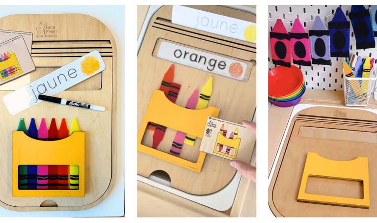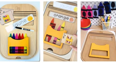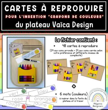 Le plateau des crayons de couleur permet à l'enfant de reproduire des petites fiches et travailler les couleurs de base, les notions «en haut, en bas, à gauche et à droite». Il permet aussi de pratiquer la pré-écriture avec la partie supérieure transparente qui s'utilise avec un crayon effaçable à sec. Vous pouvez également utiliser les petites lettres d'acrylique (dans la section option) et les superposer sur les étiquettes-mots.