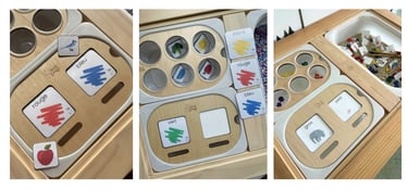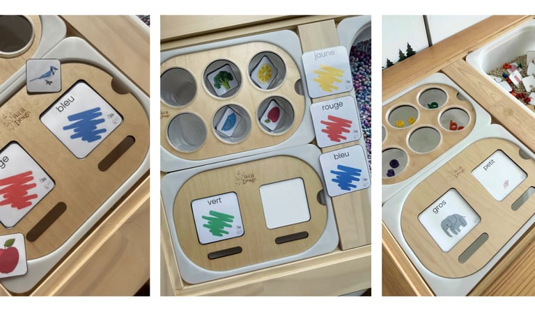 Il comporte deux fentes dans le bas ainsi que deux grands carrés blancs sur lesquels on peut dessiner, écrire avec un crayon effaçable à sec ou y ajouter des fiches que Maude vous a préparées à cet effet. Il permet de comparer les couleurs, d'opposer les objets froids aux objets chauds et les petits objets aux gros. Il y a présentement 3 options de fiches à imprimer et Maude continuera de vous en faire.