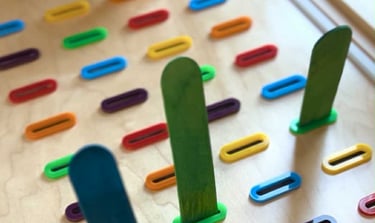 Il faut vous procurer deux ensembles de gros bâtons de popsicles que vous pourrez trouver chez Dollorama. Les insertions sont assorties aux 6 couleurs des bâtons. Il est possible d'utiliser ce plateau de l'autre côté (à l'envers) et ainsi l'utiliser sans couleur, uniquement pour la motricité des plus jeunes.
